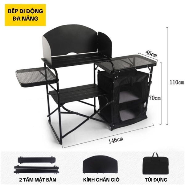 - Cấu tạo bộ bàn bếp gồm hệ thống 4 mặt bàn, đủ để bếp, các đồ dùng nấu nướng, bình nước. Bộ bàn bếp còn trang bị 1 tủ vải 2 tầng có thể cất đồ ăn gọn gàng, tránh côn trùng.