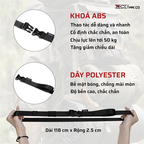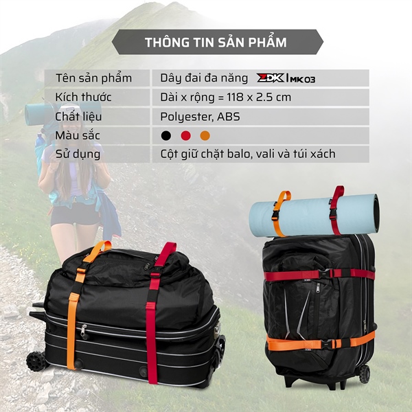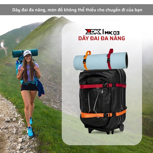 - Sử dụng dây đai đa năng MK03 giúp hành lý của bạn trở nên gọn gàng hơn khi di chuyển như leo núi, đi phượt hoặc những chuyến đi với nhiều đồ dùng cồng kềnh.