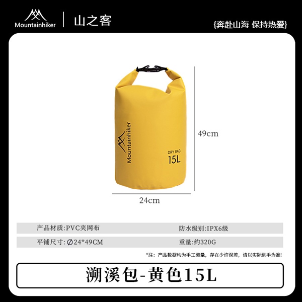- Túi khô chống nước 15L của hãng Mountainhiker là một trong những trang bị chống nước tuyệt vời đồng hành cùng những chuyến đi du lịch, dã ngoại, leo núi, cắm trại, chèo thuyền của bạn.